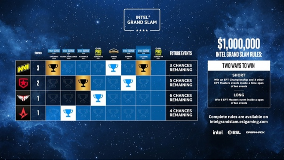 Ранее известный как Intel Grand Slam, этот цикл был запущен в 2017 году и на протяжении нескольких лет спонсировался Intel. Однако 19 марта 2025 стало известно, что компания прекращает участие в проекте, и с тех пор он называется просто ESL Grand Slam.