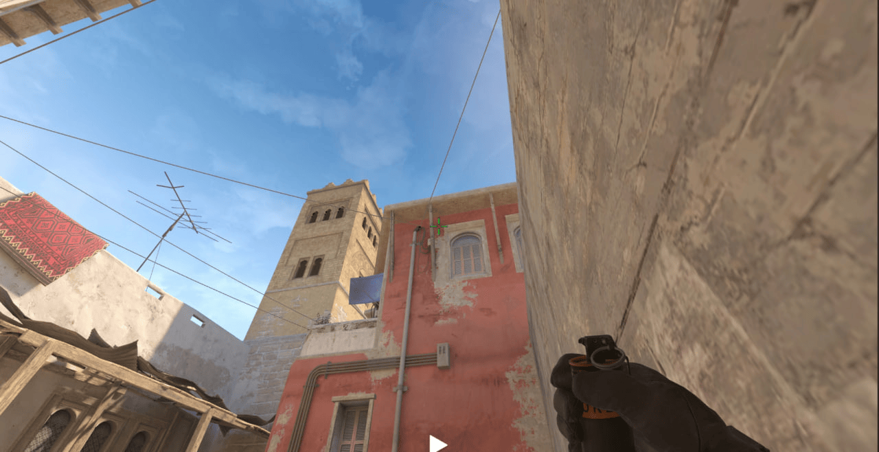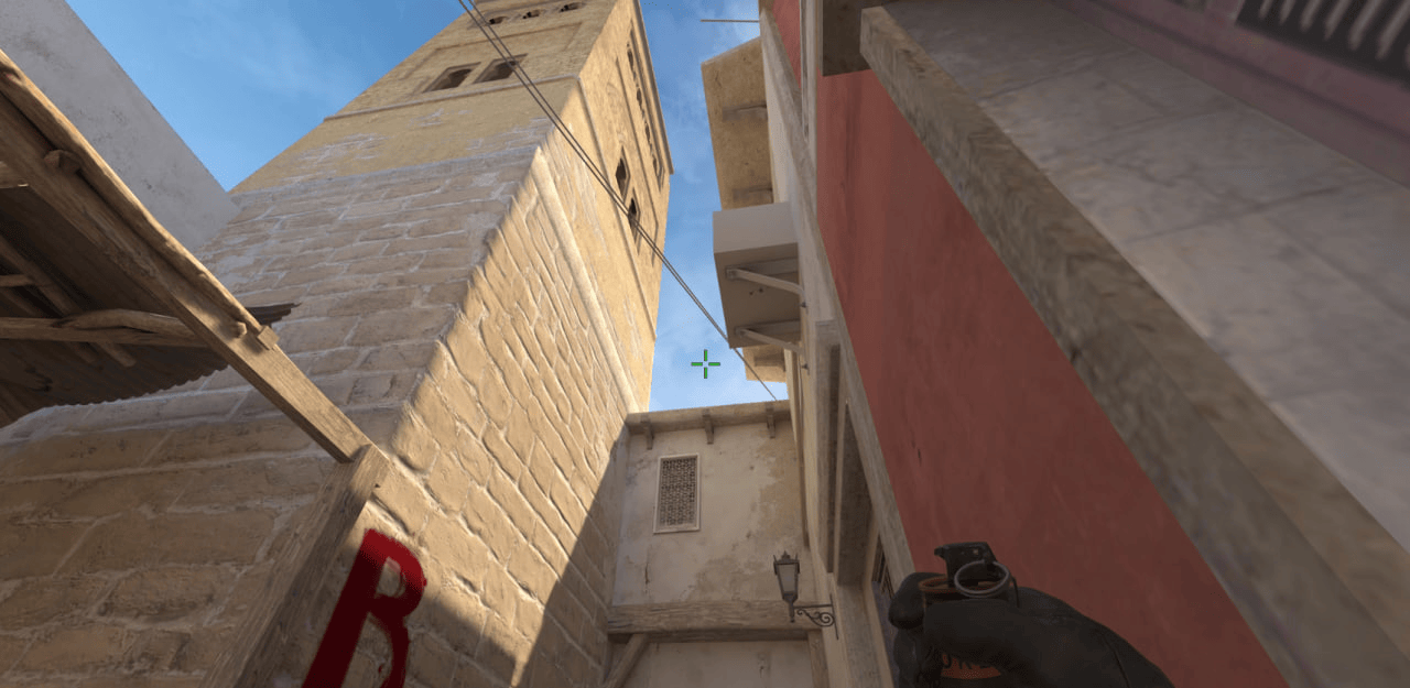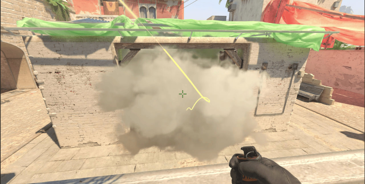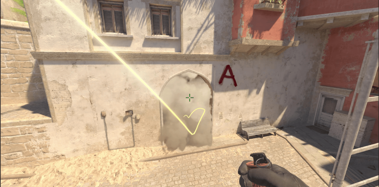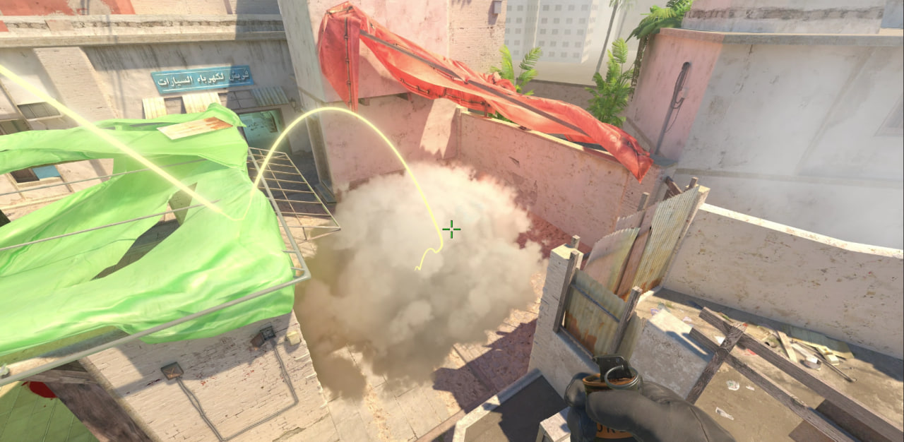 Прицелившись в эту балку кидаем гранату в прыжке и получаем идеальное задымление для игроков, подходящих на подмогу с CT