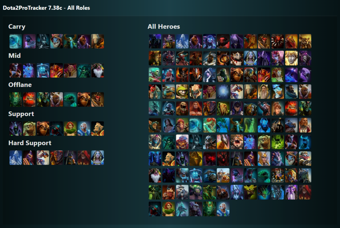 Она показывает актуальные мета-герои — тех, кого чаще всего берут профи на каждой роли: керри, мид, оффлейн, саппорты и т.д.
