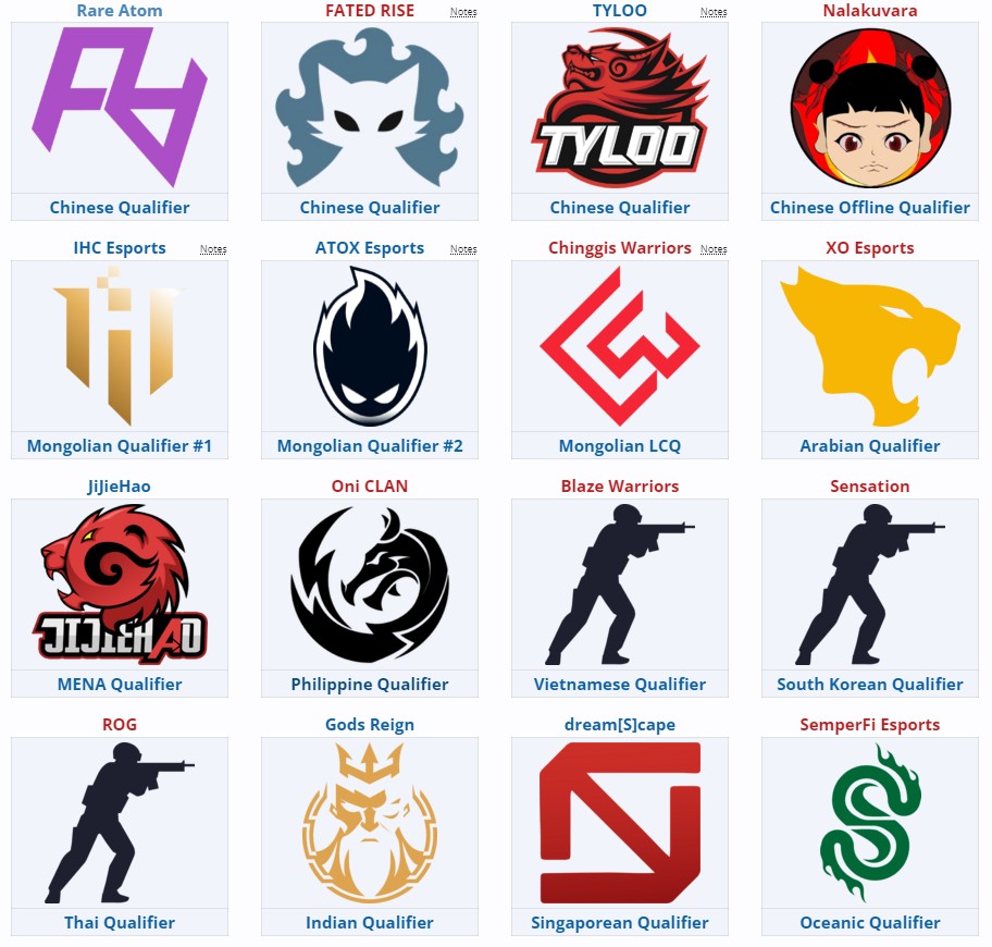 16 коллективов, все — победители квалификаций в своих регионах. В списке не хватает только The MongolZ. Состав отказался от участия в отборочном из-за плотного графика осенью.