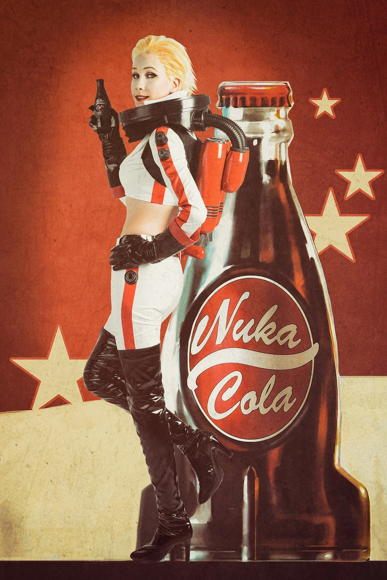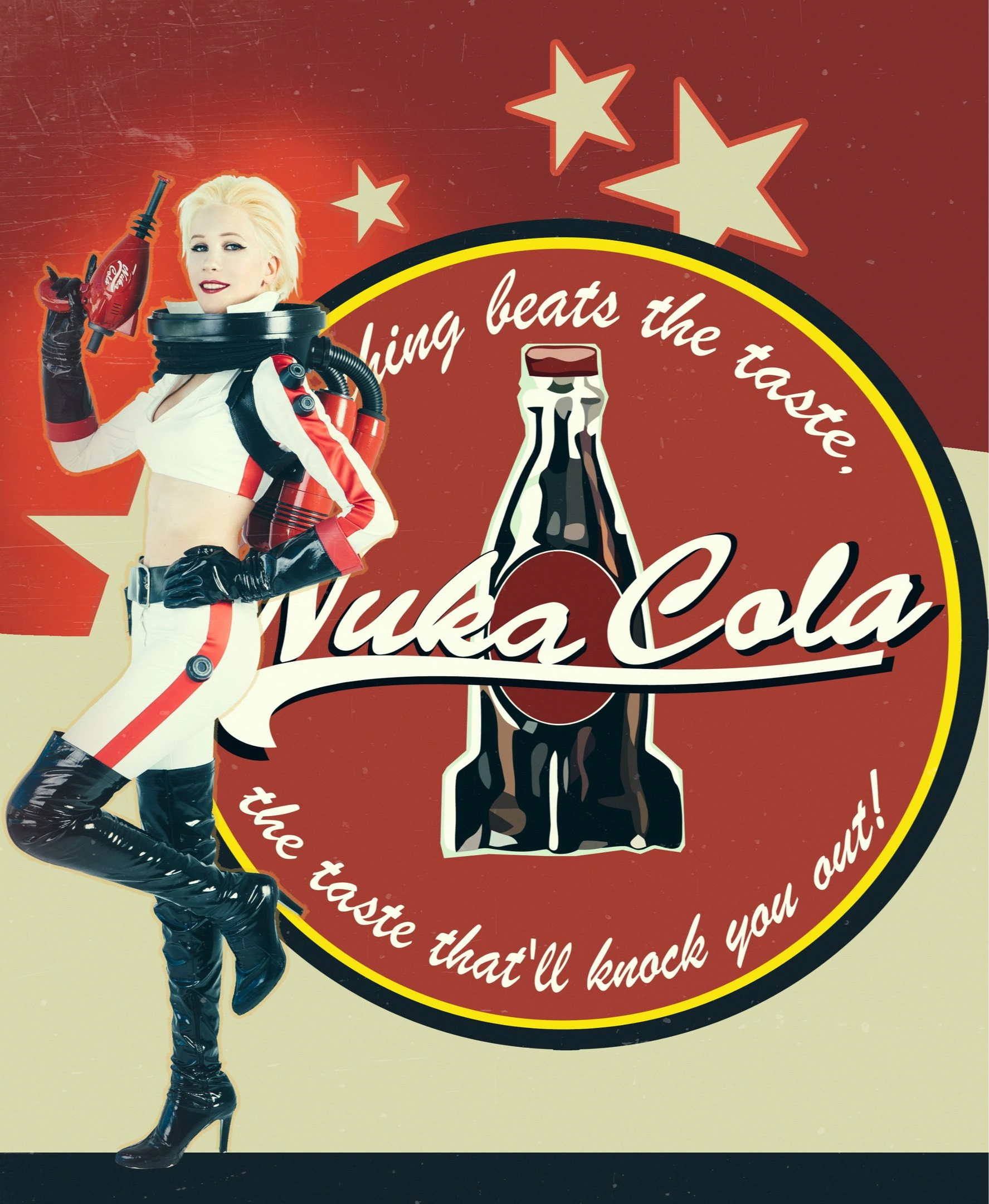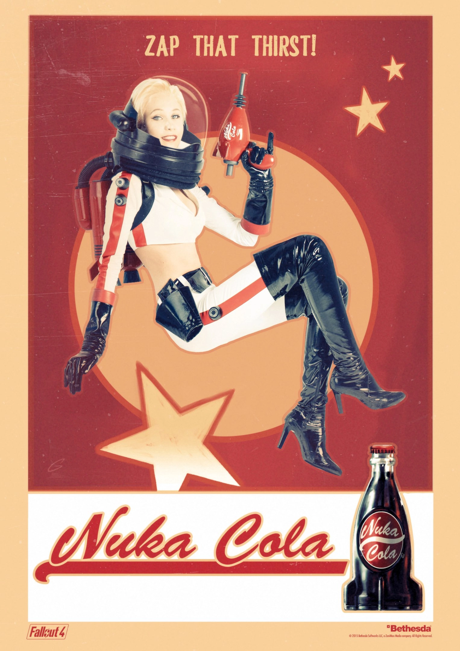Фотосессия выполнена в стилистике ретро-рекламы. Улыбчивая девушка в космическом костюме рекомендует освежиться главным американским напитком, существовавшим до наступления ядерного апокалипсиса. Да что там, производство было настолько огромным, что даже спустя сотни лет, как мир является пеплом, встретить колу на пустоши не составит никакого труда.
