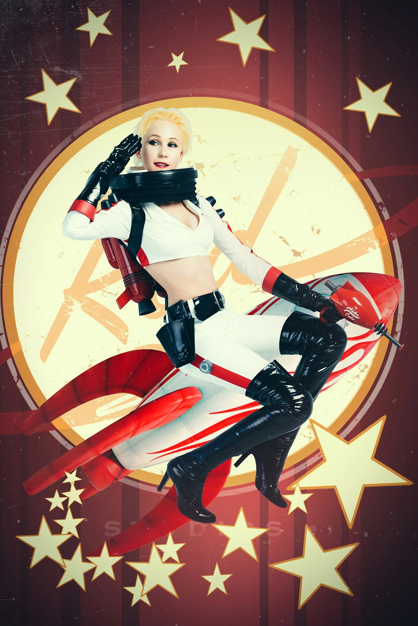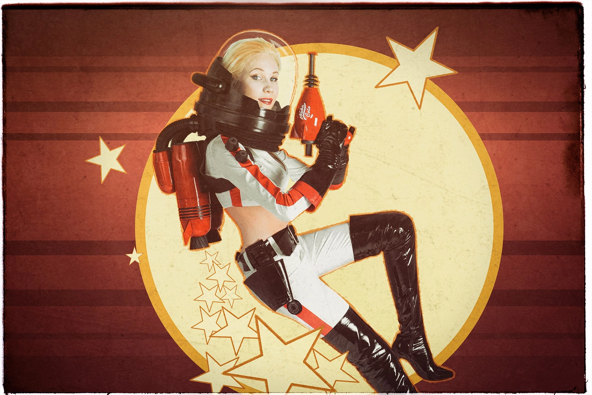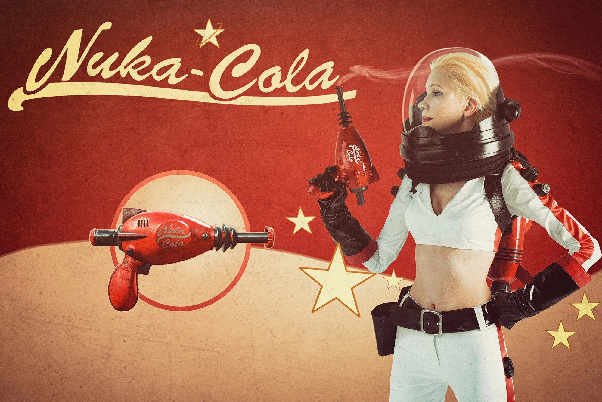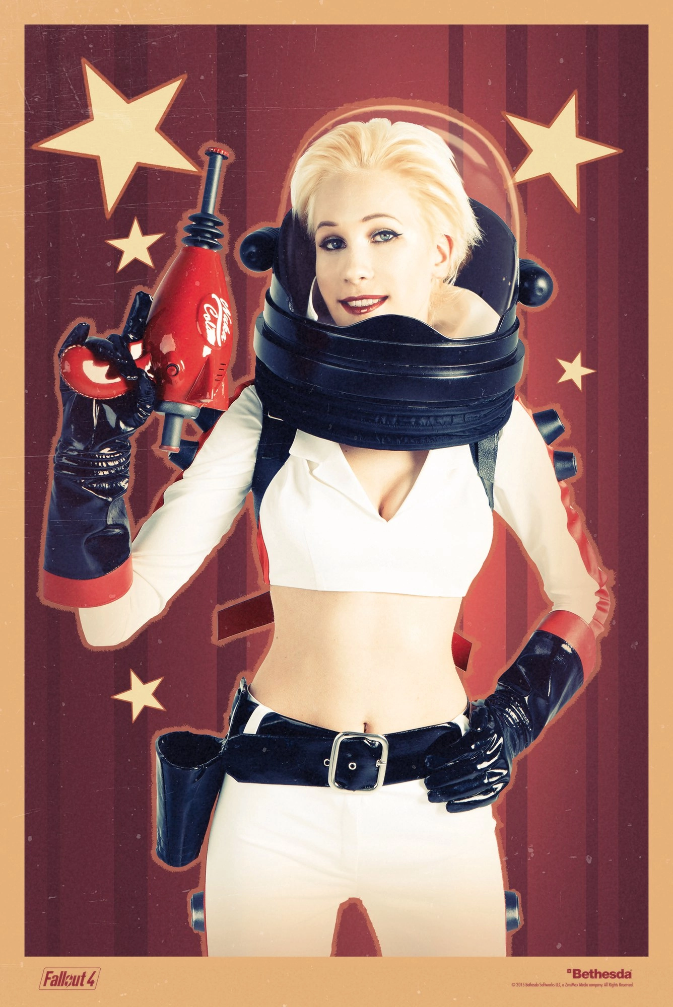Фотосессия выполнена в стилистике ретро-рекламы. Улыбчивая девушка в космическом костюме рекомендует освежиться главным американским напитком, существовавшим до наступления ядерного апокалипсиса. Да что там, производство было настолько огромным, что даже спустя сотни лет, как мир является пеплом, встретить колу на пустоши не составит никакого труда.