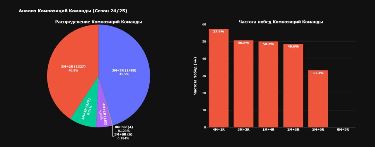 Интересно, что в прошлых сезонах картина совершенно другая. Так, в 2023/24 топовый процент побед был у пяти милишников, а онли ренжевики смогли набрать 42.9%.