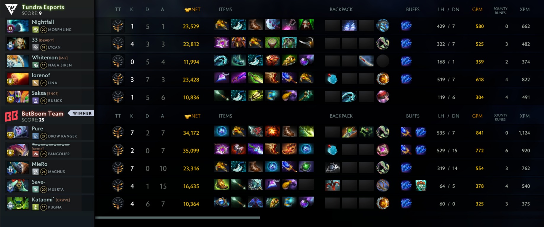 BetBoom Team начла гранд-финал Blast Slam I в качестве аутсайдера, но уже в первой игре доказала, что недооценивать ее было ошибкой. Захватив преимущество уже на пятой минуте, команда протянула его вплоть до последней — 42-й, одолев Tundra Esports со счетом 25:9.