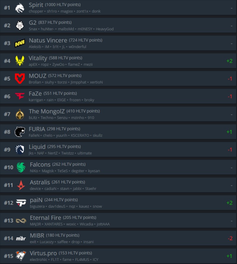 Топ-3 все тот же: Team Spirit, G2 Esports и Natus Vincere. Правда, если ничего не предпринять, то замыть трио скоро будут не черно-желтые, а Team Vitality, сделавшие +2.
