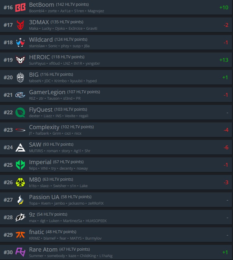 HLTV выкатил обновленный рейтинг. Самый значимый прирост в апдейте от 20 января показала BetBoom Team, взлетевшая вверх подобно ракете аж на 10 позиций.