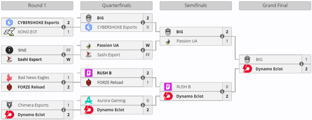 В решающем матче ивента столкнулись BIG (#20 HLTV) и Dynamo Eclot (#60 HLTV). Разница в рейтинге не помогла немцам добиться успеха — best-of-3 серия закончилась в пользу андердогов со счетом 2:1 (13:8 на Mirage, 14:16 на Nuke и 16:14 на Amcient).