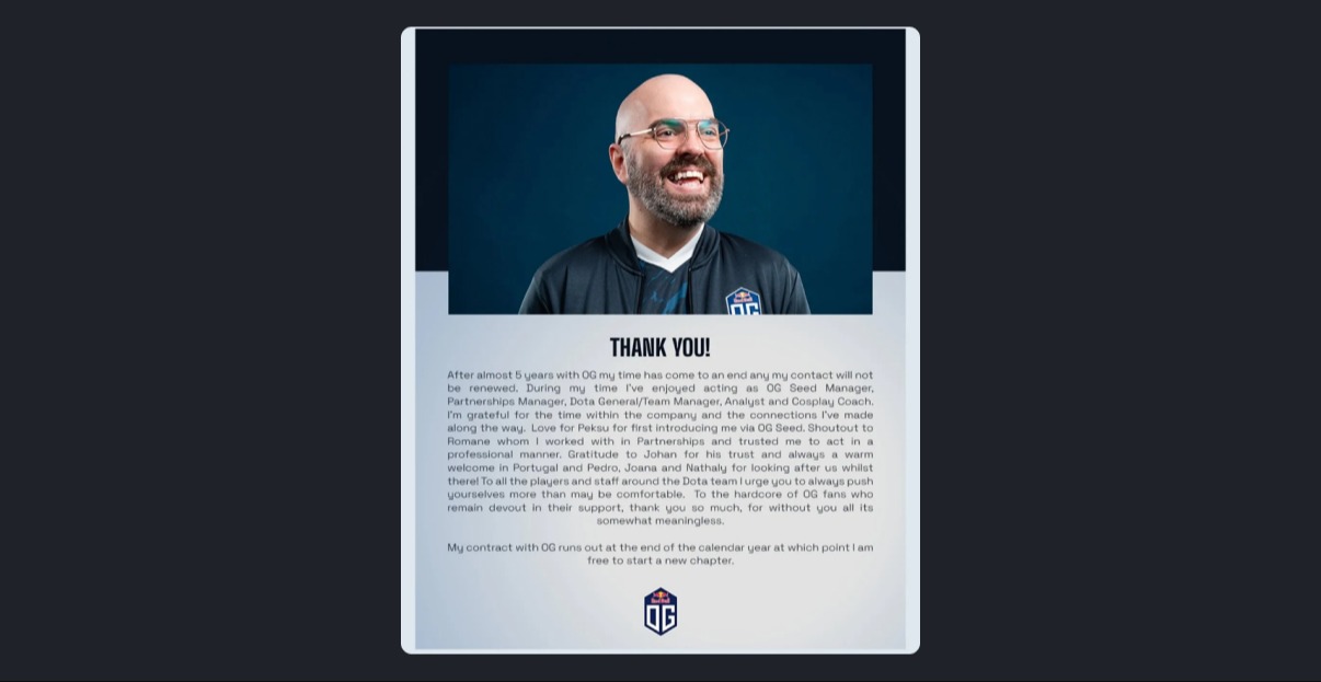 Аллен Bonkers Кук покинул пост менеджера состава OG по Dota 2 по завершении контракта с организацией. Об этом сообщили на официальной странице OG в X [Заблокирована в РФ]. Сам Кук заявил, что сейчас находится в поисках нового клуба.