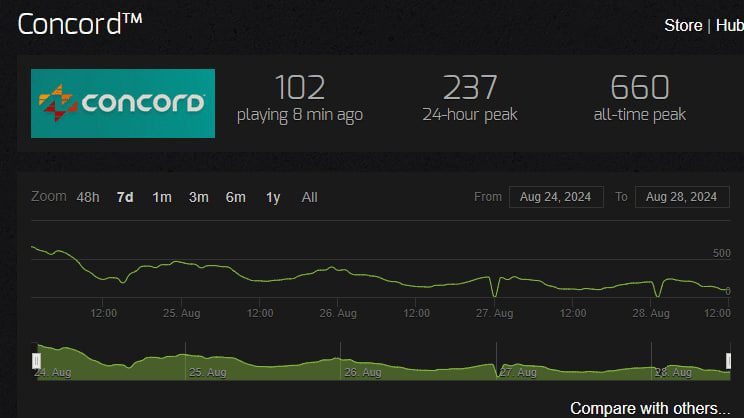 Официальный релиз Concord состоялся несколько дней назад. Игра погрязла в скандалах и критике. А на сегодняшний день (28.08.2024) в игру почти не играют.