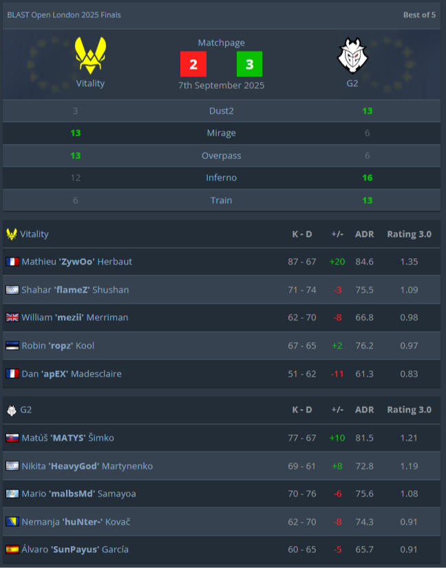 G2 Esports стала чемпионом BLAST Open London после победы над Team Vitality в напряжённом финале, завершившемся со счётом 3:2. Этот трофей стал первым для коллектива в 2025 году и первым под руководством Немани huNter- Ковача, который взял на себя роль капитана всего два месяца назад.