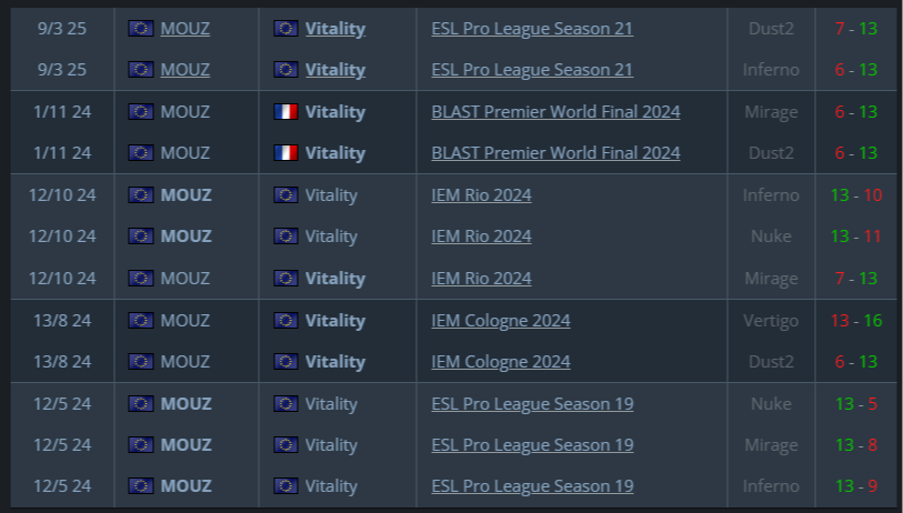 Противостояние между Team Vitality и MOUZ в последние месяцы складывается крайне односторонне. Почти все встречи заканчивались сухим счётом.