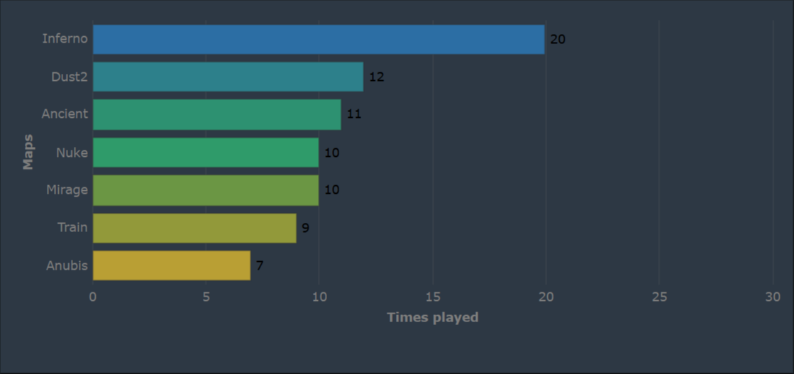 На втором месте с существенным отставанием — Dust 2 (12 пиков), третья — Ancient (11 пиков).
