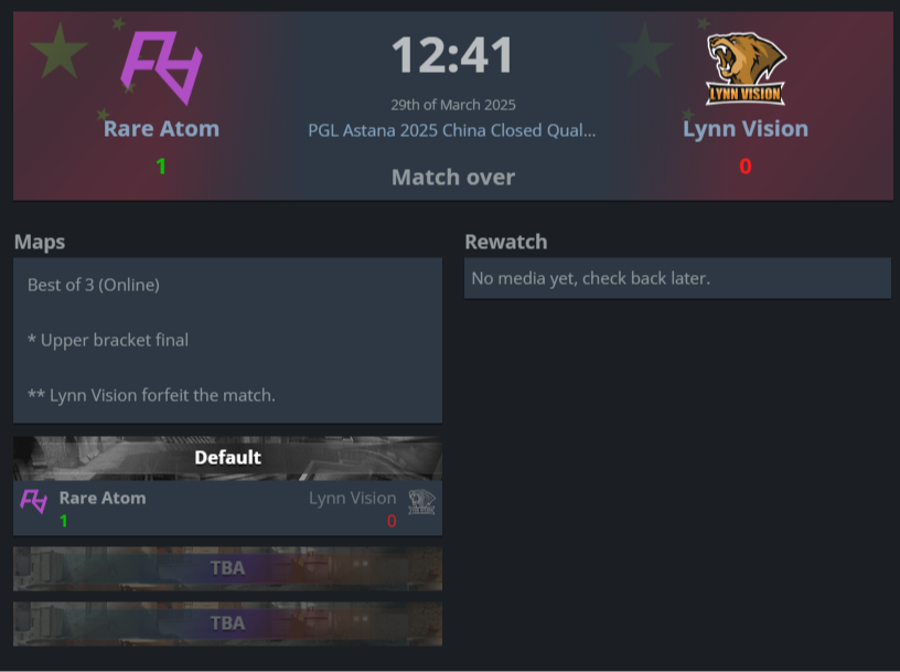 Команда Lynn Vision приняла решение снять себя с матча против Rare Atom в закрытых квалификациях к PGL Astana, сославшись на конфликт интересов в рейтинговой системе VRS. Это позволило Rare Atom пройти в гранд-финал и получить очки за техническую победу. Однако команды могут вновь встретиться в финале нижней сетки.