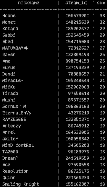 На первом месте — Владимир No[o]ne Миненко: 33 раза он под шумок вырывал эгиду прямо из-под носа соперников. На втором — Monet (32 кражи), а самым свежим похитителем стал SabeRLighT-, укравший артефакт у Nigma Galaxy 8 апреля на ESL One Raleigh 2025.