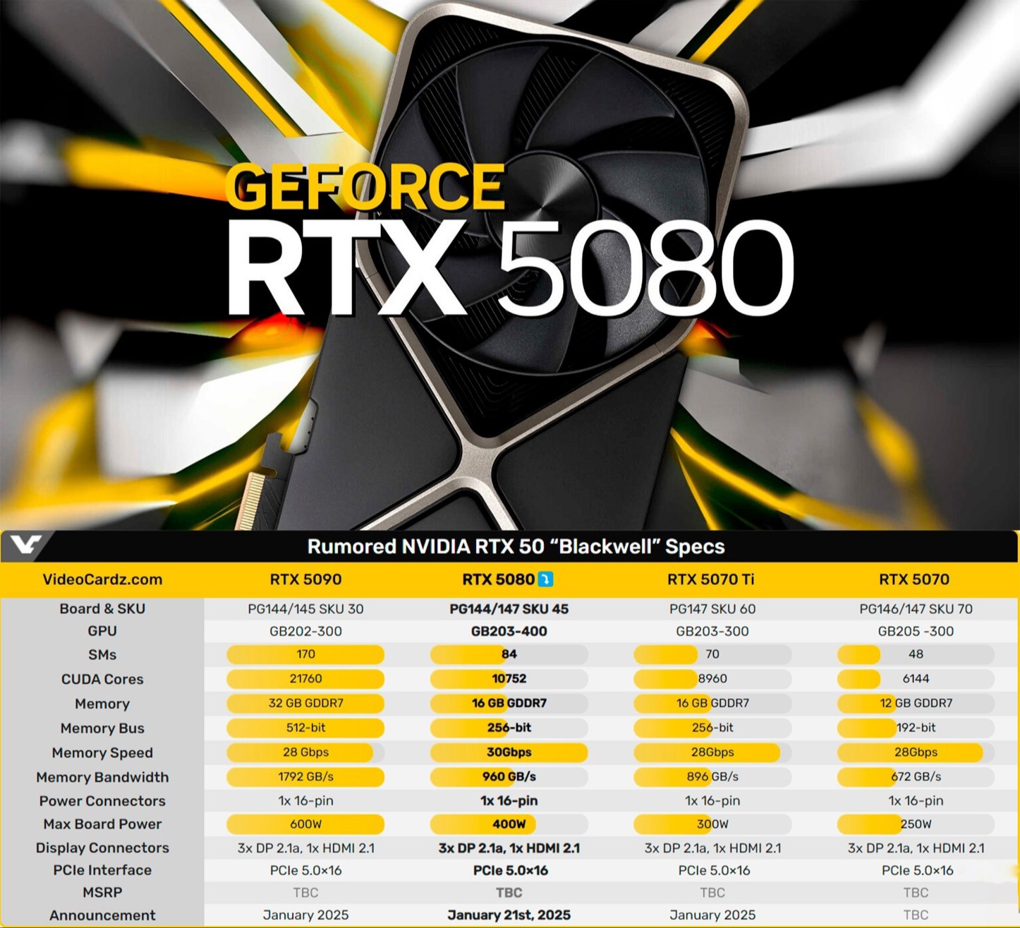 По слухам, GeForce RTX 5080 станет первой видеокартой нового поколения, открывающей серию RTX 5000. Флагманскую модель RTX 5090 представят позже, но пока основное внимание приковано именно к RTX 5080.