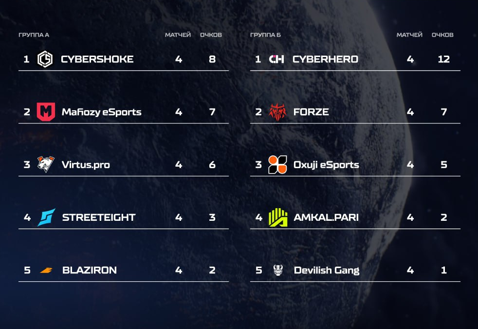 Более успешная четверка стартует с 1/2 верхней сетки: CYBERSHOKE, FORZE Esports, CYBERHERO, Mafiozy eSports.
