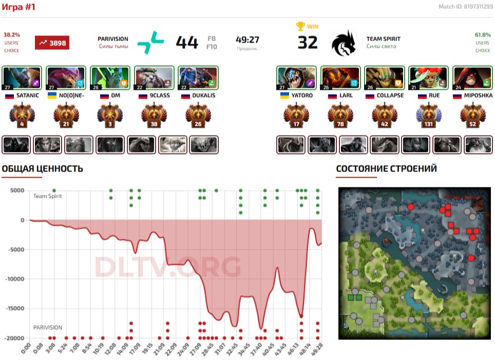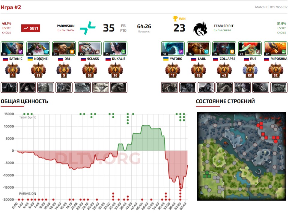 Преимущество в нетворсе PARIVISION застыло на графике как стрелка на часах утонувшего Титаника. Команда тащила с нулевой и должна была заканчивать карту победой, но банально не дождалась байбеков. В первую очередь на керри-Магнусе — до отката оставалось 3+ минуты.