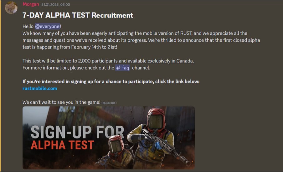 Разработчики RUST Mobile анонсировали первый альфа-тест игры, который пройдёт с 14 по 21 февраля. Тестирование будет доступно только для пользователей Android, проживающих в Канаде.