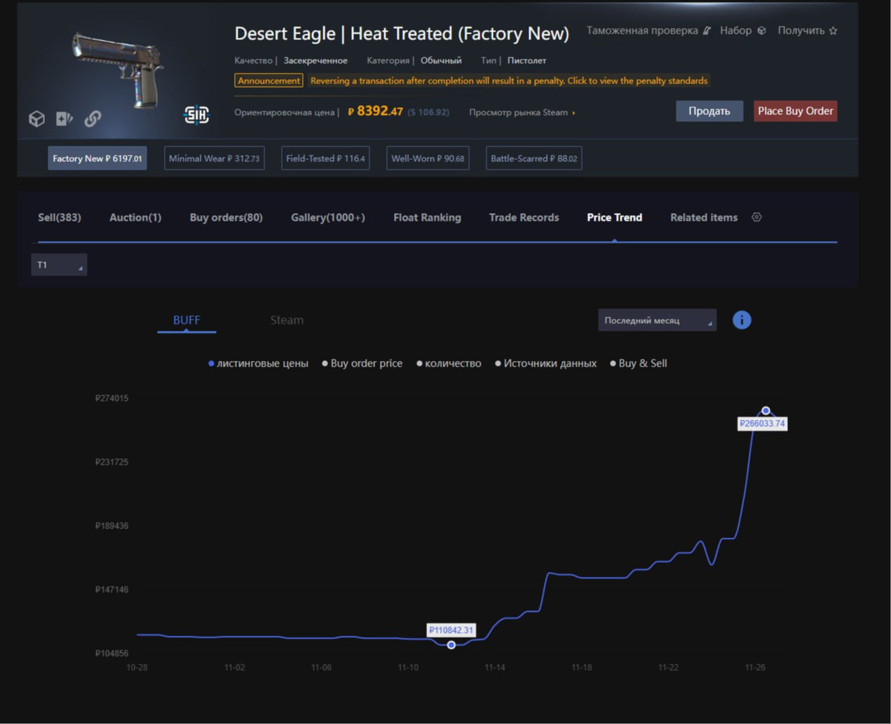За последние десять дней топ-паттерны Desert Eagle «Термическая обработка» внезапно улетели в цене в 2–3 раза. Рынок долго стоял на дне, но кто-то, судя по динамике, решил, что ситуация «несправедлива», и начал агрессивный выкуп лимитированных диглов.