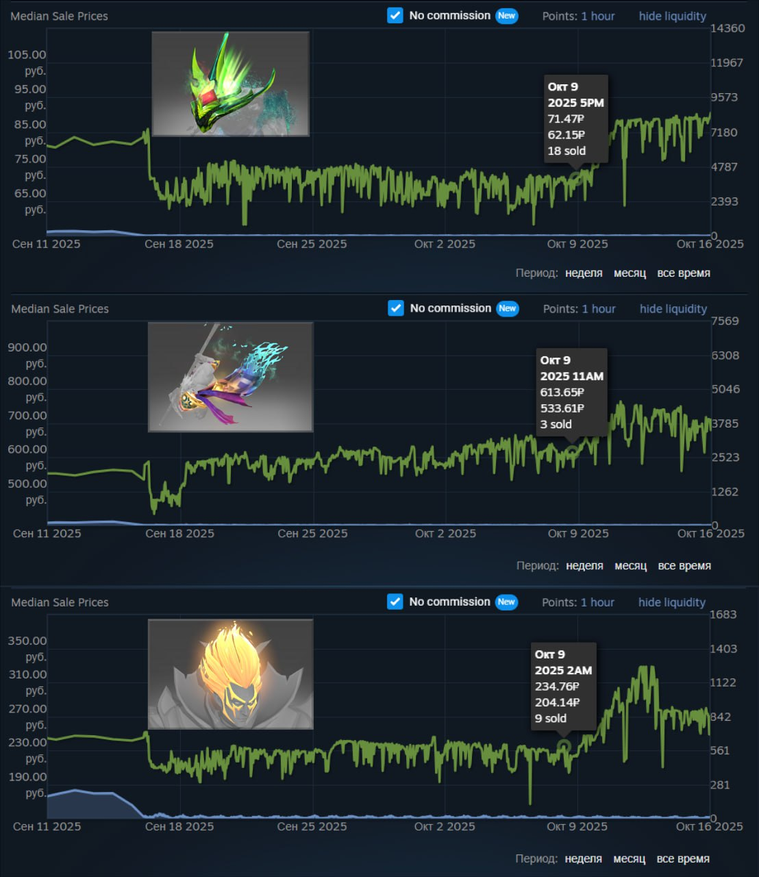 После введения недельного трейд-бана на предметы в Dota 2 рынок испытал всплеск активности, стоимость многих популярных скинов выросла на десятки процентов. Причина проста: в течение первых семи дней после покупки предмет нельзя было продать или обменять, что создало временный дефицит на торговой площадке.