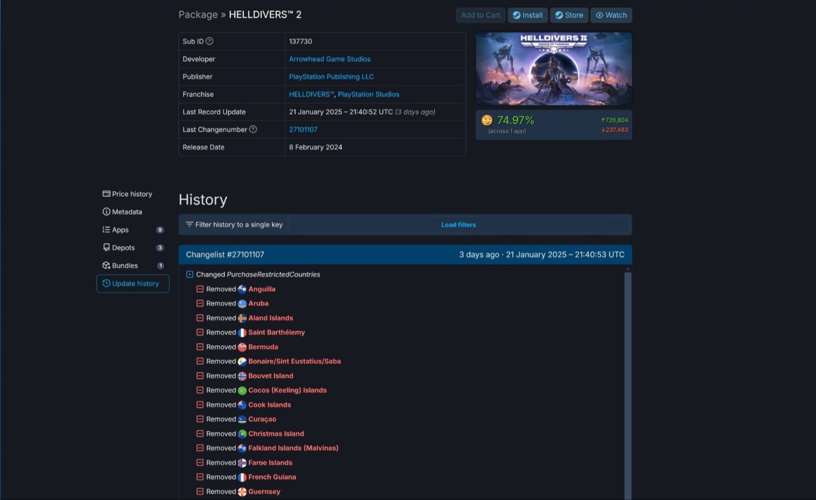 - Удаление и возвращение игр в Steam: Helldivers 2 недавно исчезала из 50 регионов, а затем снова возвращалась. Подобная ситуация произошла и с Horizon Forbidden West, который временно сняли с продажи в 130 регионах.