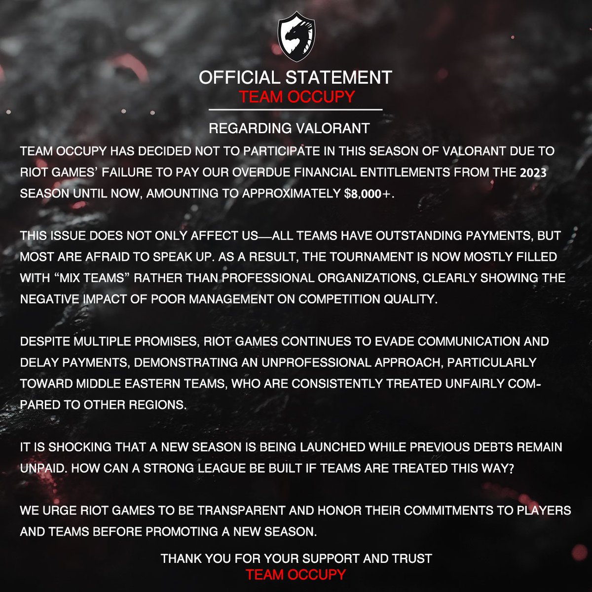 Египетская организация тир-3 уровня Occupy официально объявила об отказе выступать на профессиональной сцене в дисциплине VALORANT. Представители клуба заявляют, что партнеры, которые в том числе связаны напрямую с Riot Games, не выплачивают призовые с 2023 года. Долг больше $8000.
