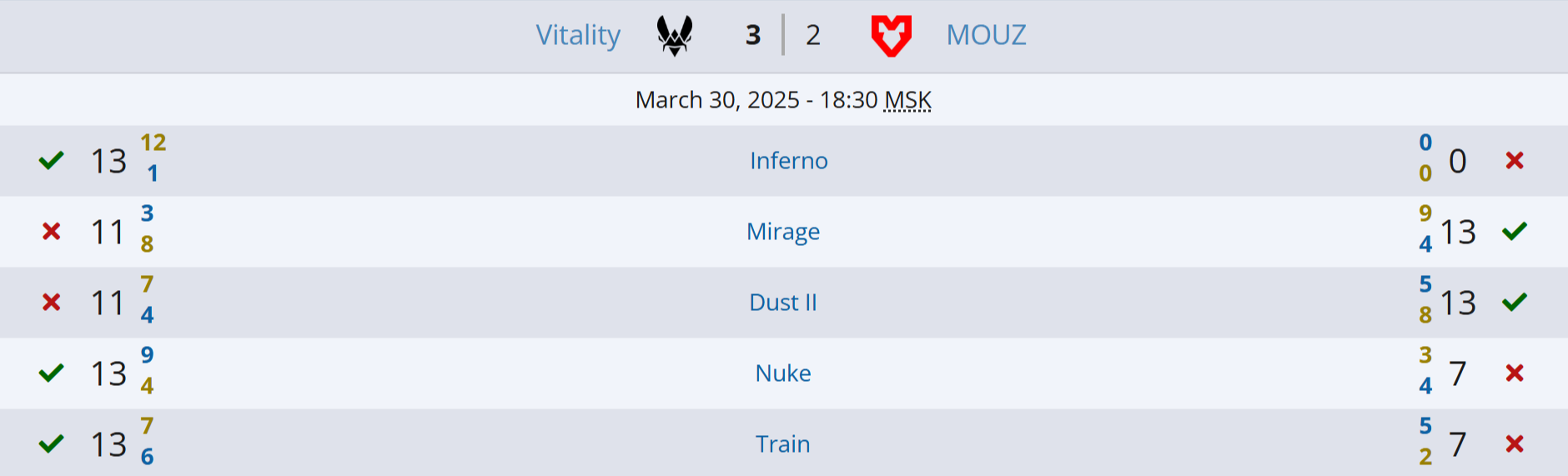 Схватка Team Vitality против MOUZ в гранд-финале BLAST Open Lisbon 2025 завершилась победой французов со счетом 3:2.