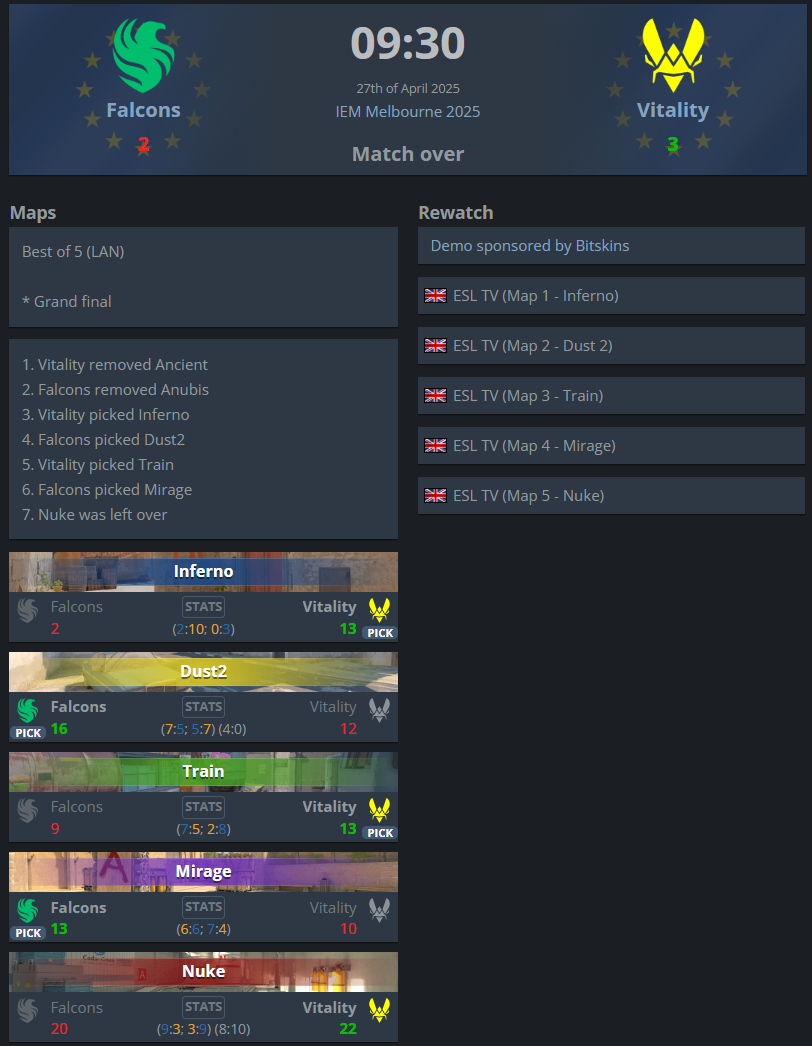 В гранд-финале турнира Team Vitality победила Team Falcons со счётом 3–2 (Inferno — 13:2, Dust2 — 12:16, Train — 13:9, Mirage — 10:13, Nuke — 22:20). На решающей карте Vitality отыгралась со счёта 6:12.