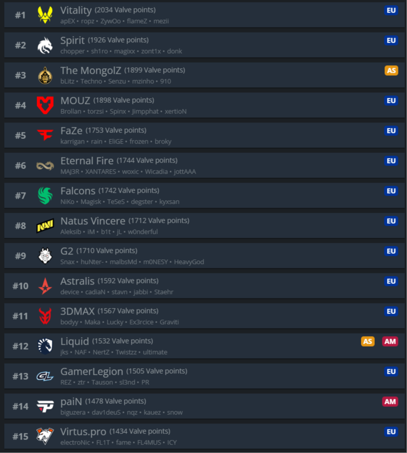Помимо свапа местами между Team Spirit и Team Vitality в топ-5 изменений не произошло, но несколько команд улучшили свои позиции: