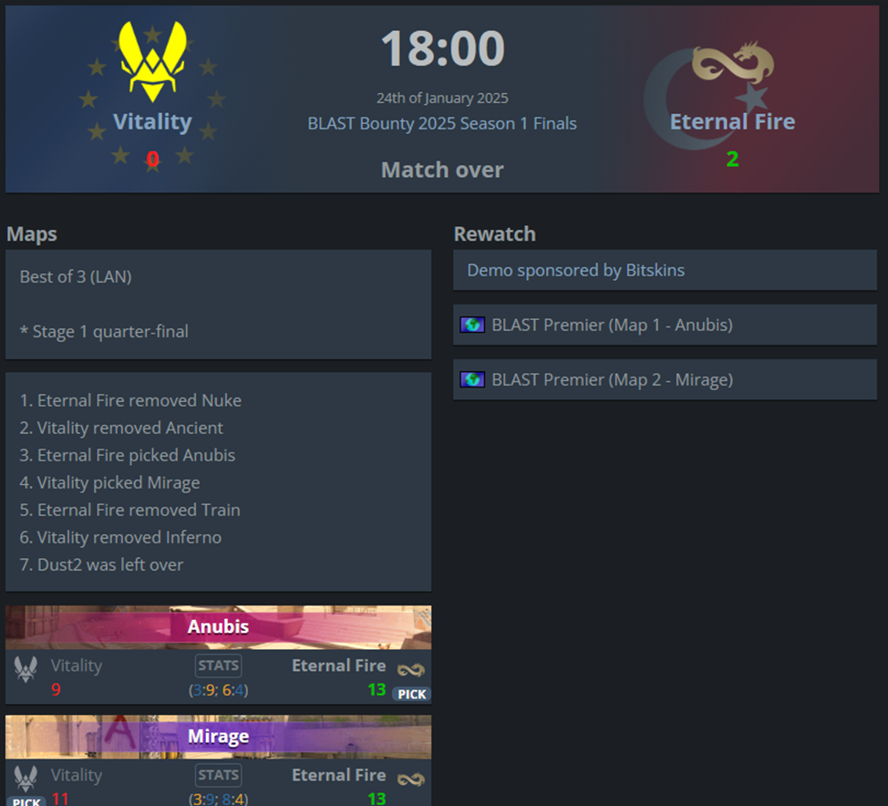 Последнее поражение Vitality датируется 24 января 2025 года, когда команда уступила Eternal Fire на BLAST Bounty 2025 Season 1 Finals. С тех пор «пчёлы» не проиграли ни одного матча — ровно три месяца праймовой формы.