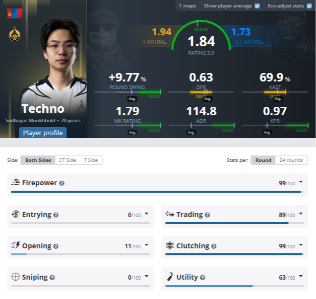 Techno превзошёл таких звёзд, как XANTARES (1.30), ZywOo (1.29) и m0NESY (1.26). В составе The MongolZ вторым по эффективности стал капитан bLitz (1.25), а также Senzu (1.16).
