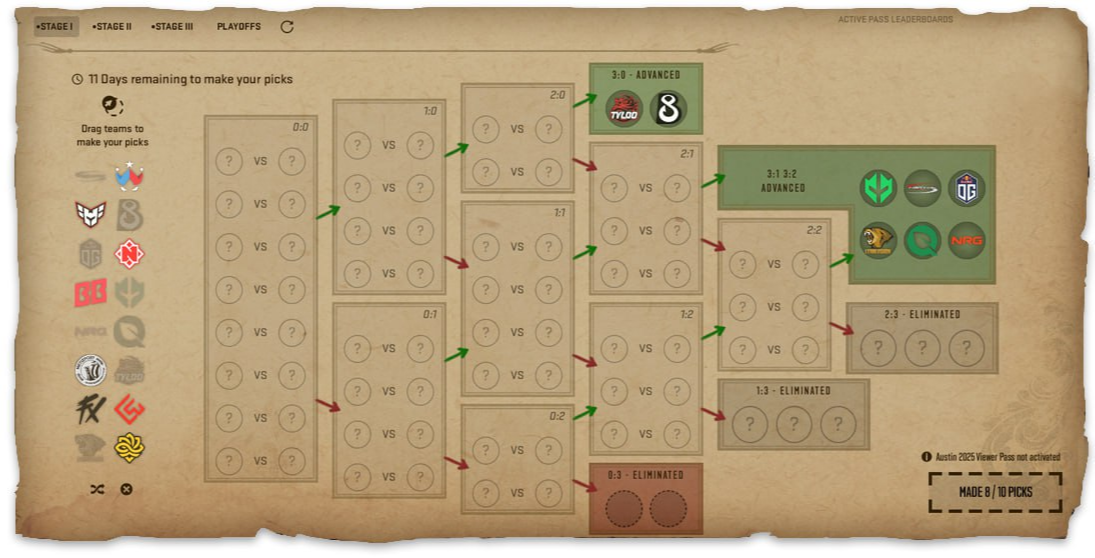 - Viewer Pass — пропуск зрителя, дающий доступ к Pick'Em-челленджу и внутриигровым заданиям;