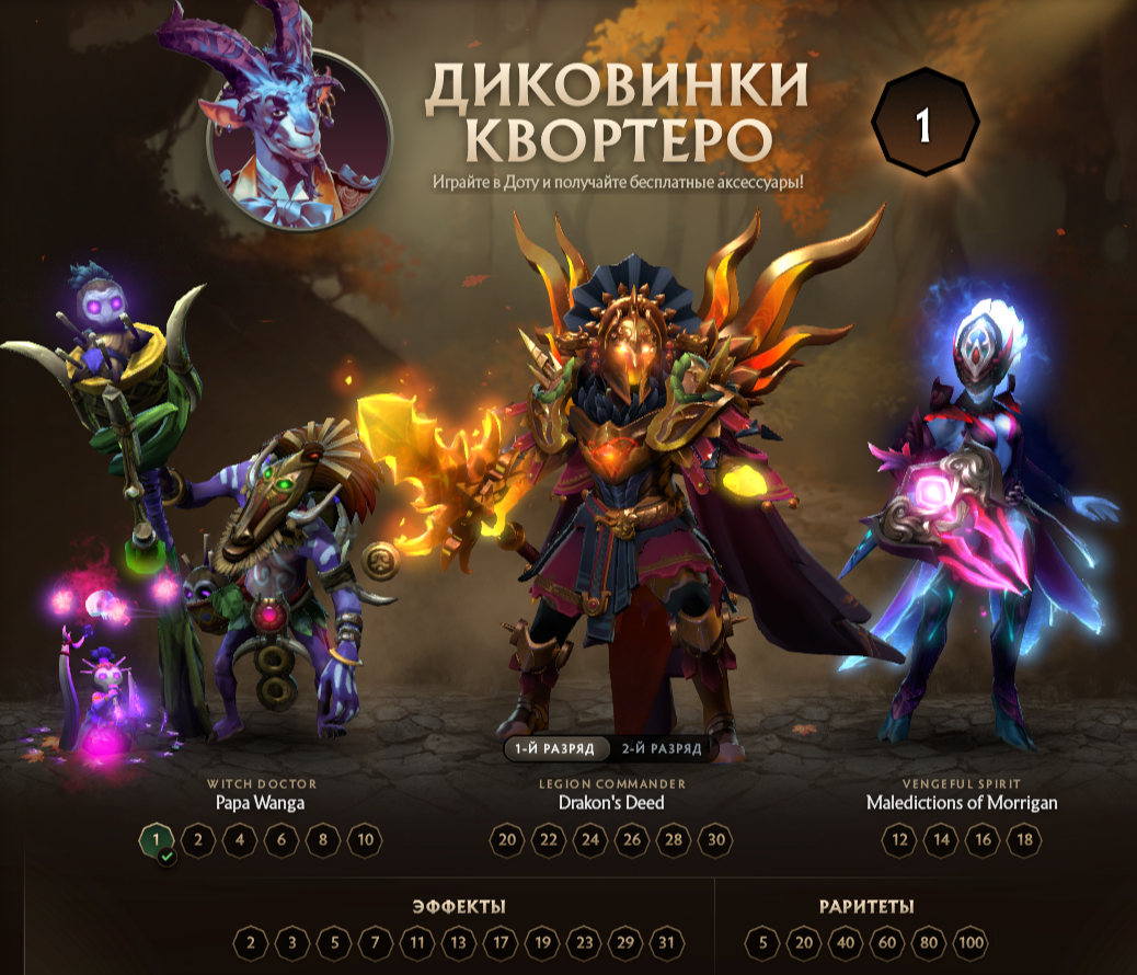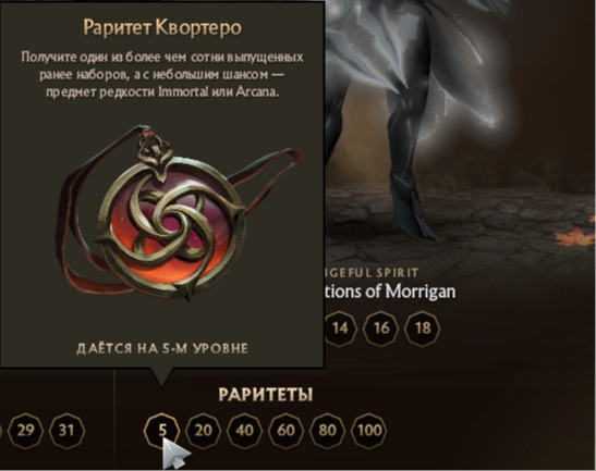 Сундуки «Раритет Квортеро» на уровнях 5, 20, 40, 60, 80 и 100. Они содержат одну из сотен ранее выпущенных косметических коллекций, а на 100-м уровне появляется шанс получить предмет редкости Immortal или аркану
