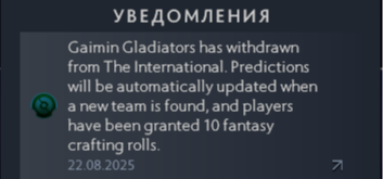 После неожиданного отказа Gaimin Gladiators от участия в The International 2025, Valve добавили всем пользователям по 10 дополнительных жетонов для фэнтези-лиги.