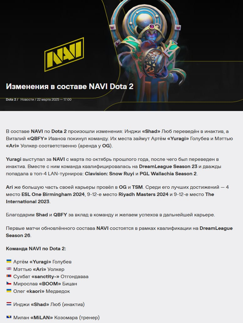 Natus Vincere объявили о кадровых изменениях в составе Dota 2. Команду покинули Инджи Shad Люб и Виталий QBFY Иванов, а их места заняли Артём Yuragi Голубев и Мэтью Ari Уокер. Об этом организация сообщила на официальном сайте.