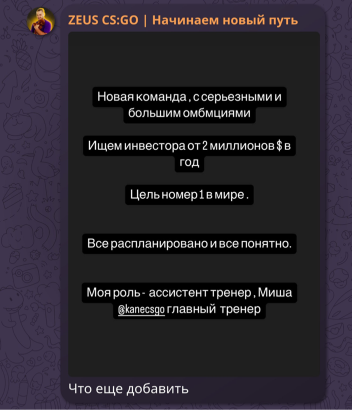 Экс-капитан Natus Vincere Даниил Zeus Тесленко объявил о создании новой команды по CS2 совместно с Михаилом Kane Благиным, бывшим тренером Passion UA. Они открыли поиск инвестора, готового вложить от $2 000 000 в год.